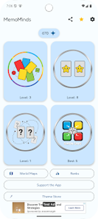 Spelarna kan följa sin utveckling genom att klättra upp genom åtta unika nivåer, från Novice till Mythic Mind, vilket ger en känsla av prestation. MemoMinds erbjuder också möjlighet att spela offline, vilket gör det enkelt att träna hjärnan när som helst och var som helst. Med fyra olika spellägen och en belönande progression är detta spel en utmärkt val för den som vill förbättra sina mentala färdigheter på ett roligt och tillgängligt sätt.